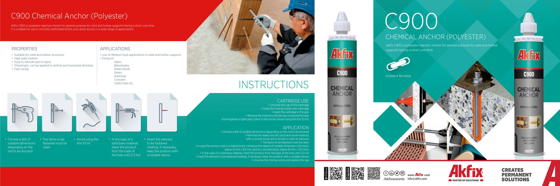 Akfix C900 ist ein Polyester-Injektionsmörtel für allgemeine Zwecke. Es ist für feste und hohle Träger mit kurzer Aushärtungszeit und eignet sich für den Einsatz in Beton, Lochsteinen und Hohlblocksteinen.
